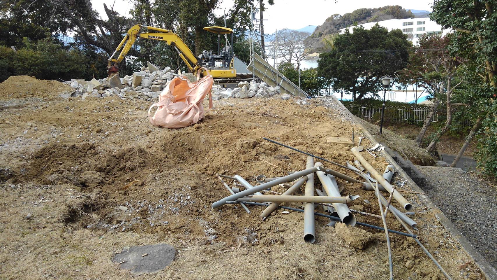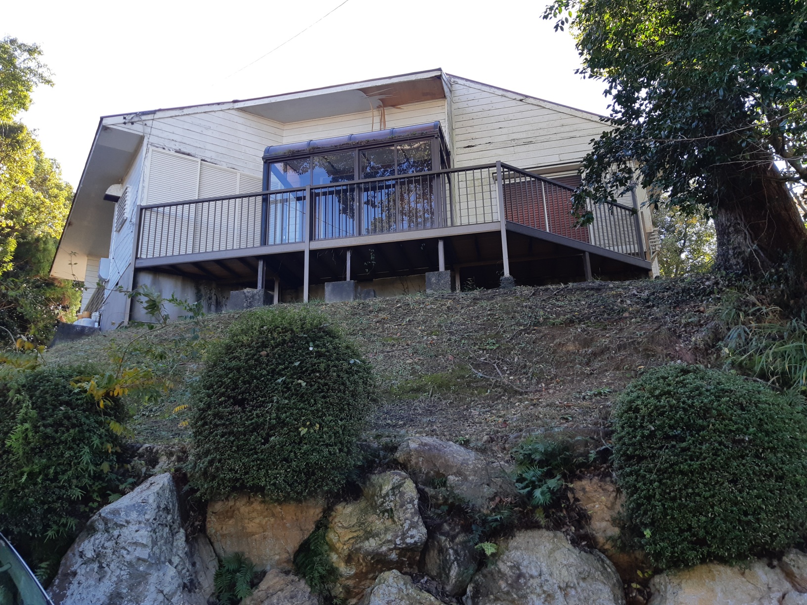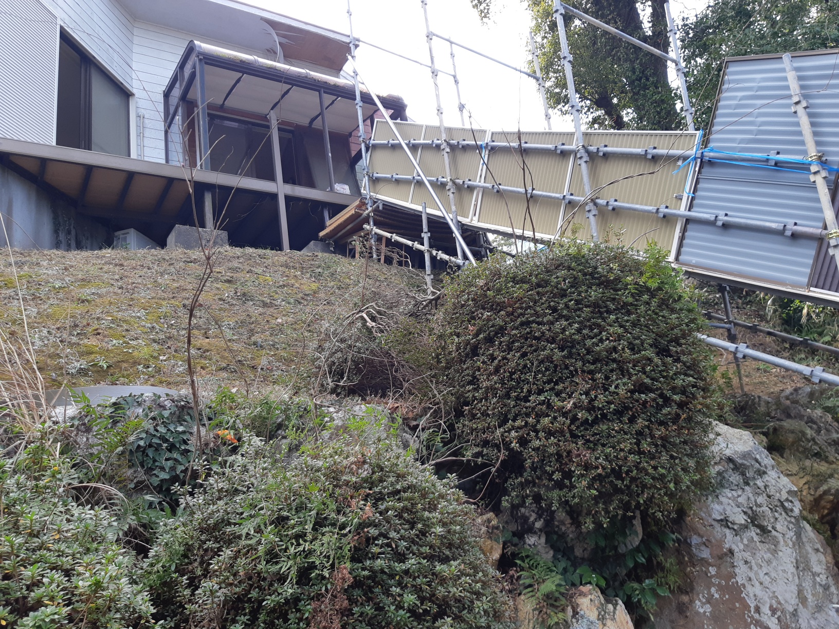 地形として、建築粘度の古い別荘にあたりますので、その後建築された別荘に工事車両・重機などの進入ルートが遮られ、崖の上の建物解体となりました。
