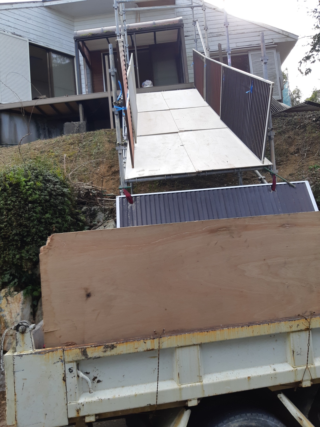 次は作業員との間で、解体廃材の搬出の検討です。手作業で持って降りればいいわけですが、工事収益と日程をにらめっこし、最適な方法で、かつ安全を補完できる仮設などを検討しました。最終的に単管仮設で、シューターを設置し、スライドさせる方法を選定し、車両投入の際は周辺の状況など立会も付けて、作業を行いました。