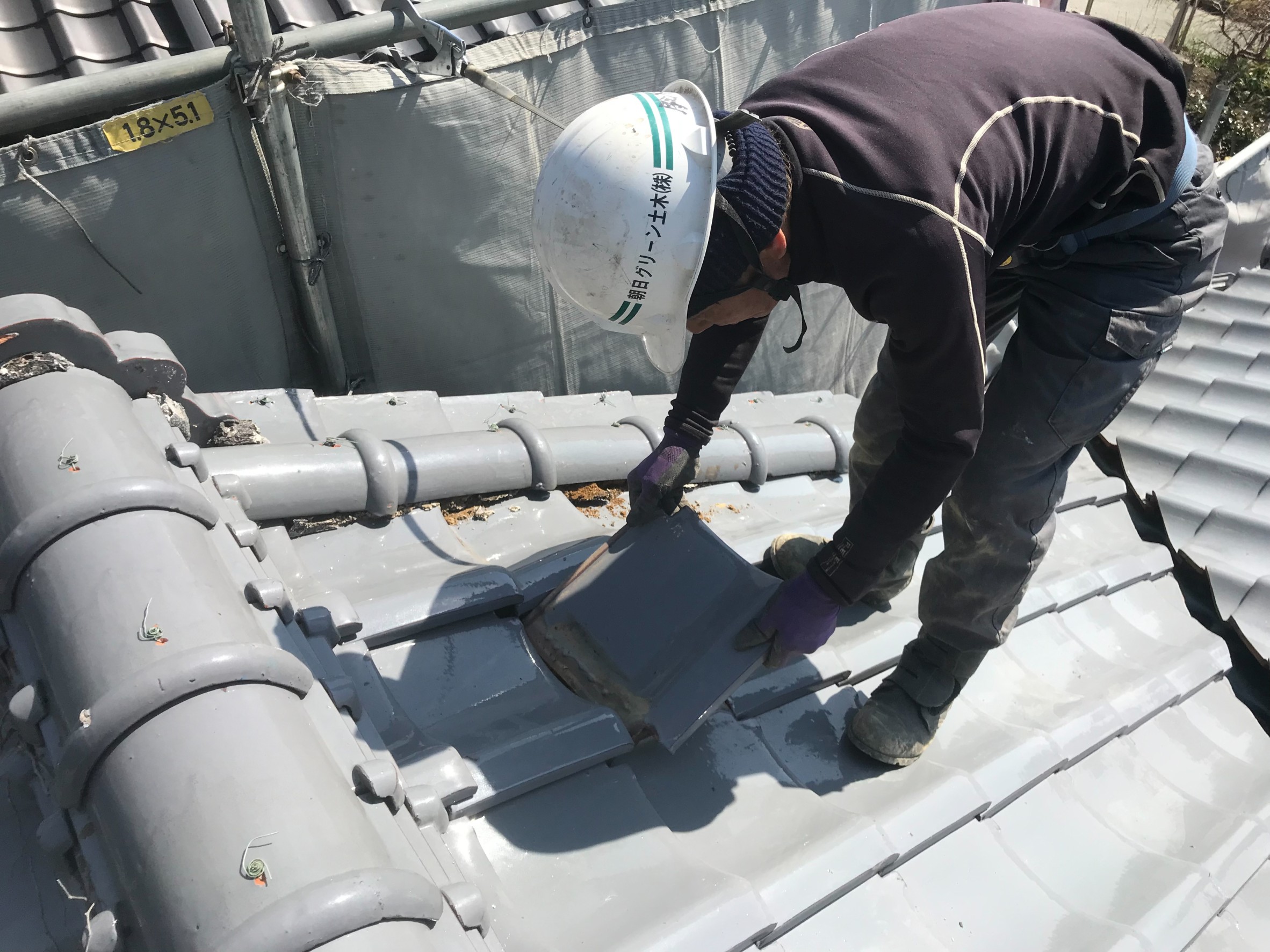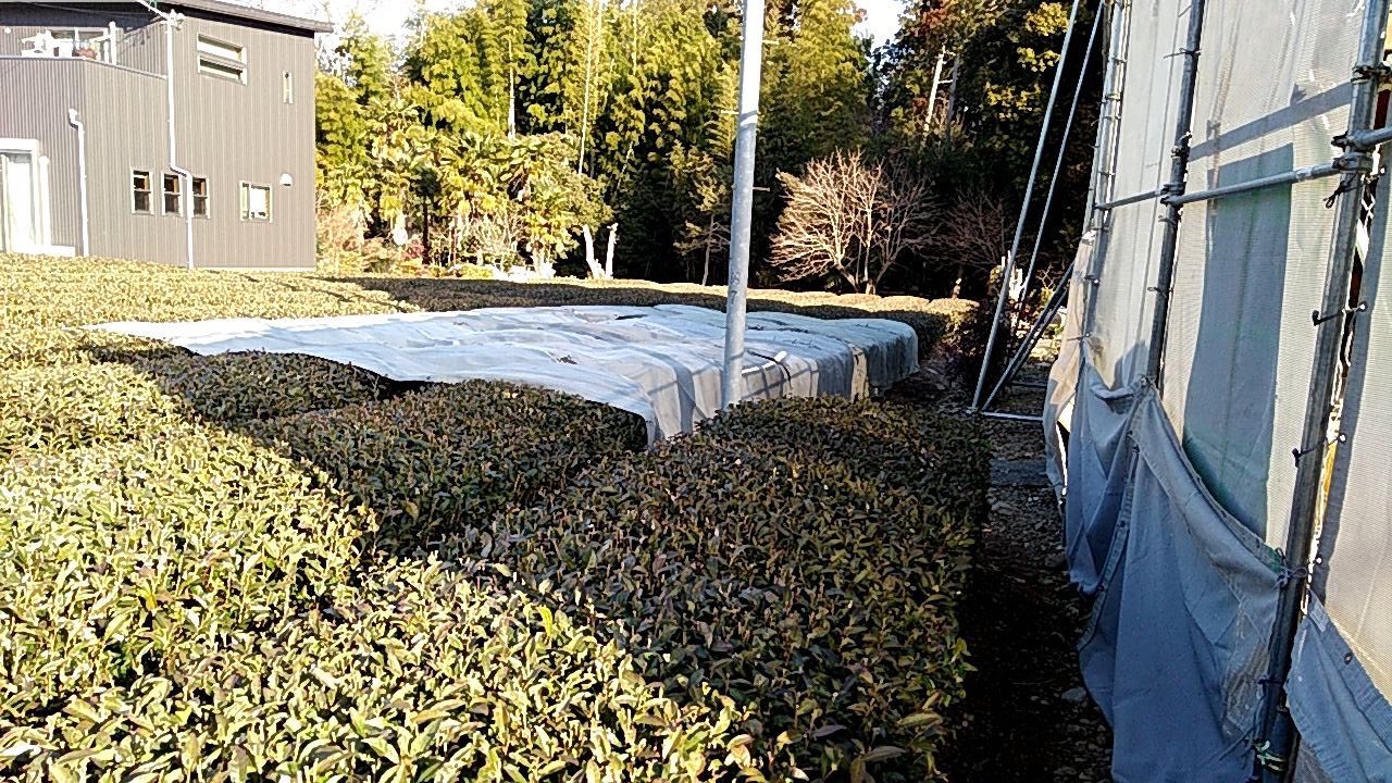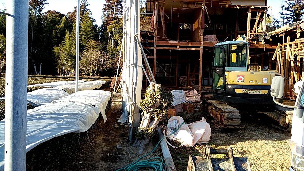 続いて養生です。 周囲が茶畑にて、養生周辺に更に茶畑上に養生をして解体しました。瓦撤去です。