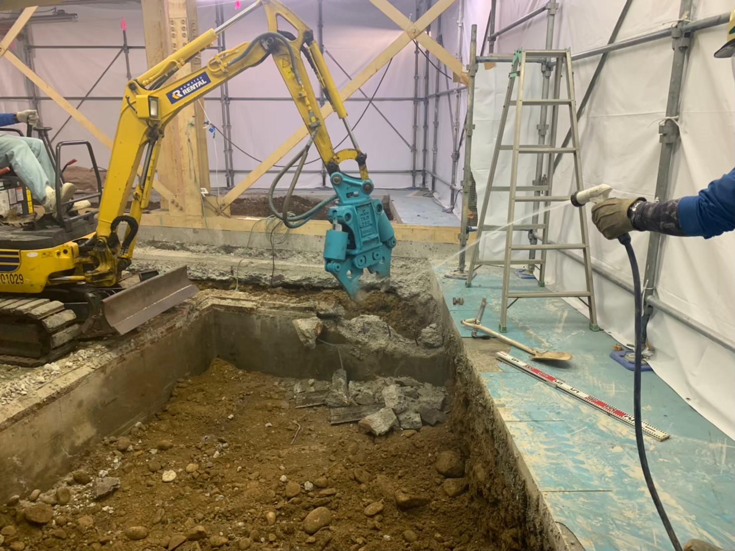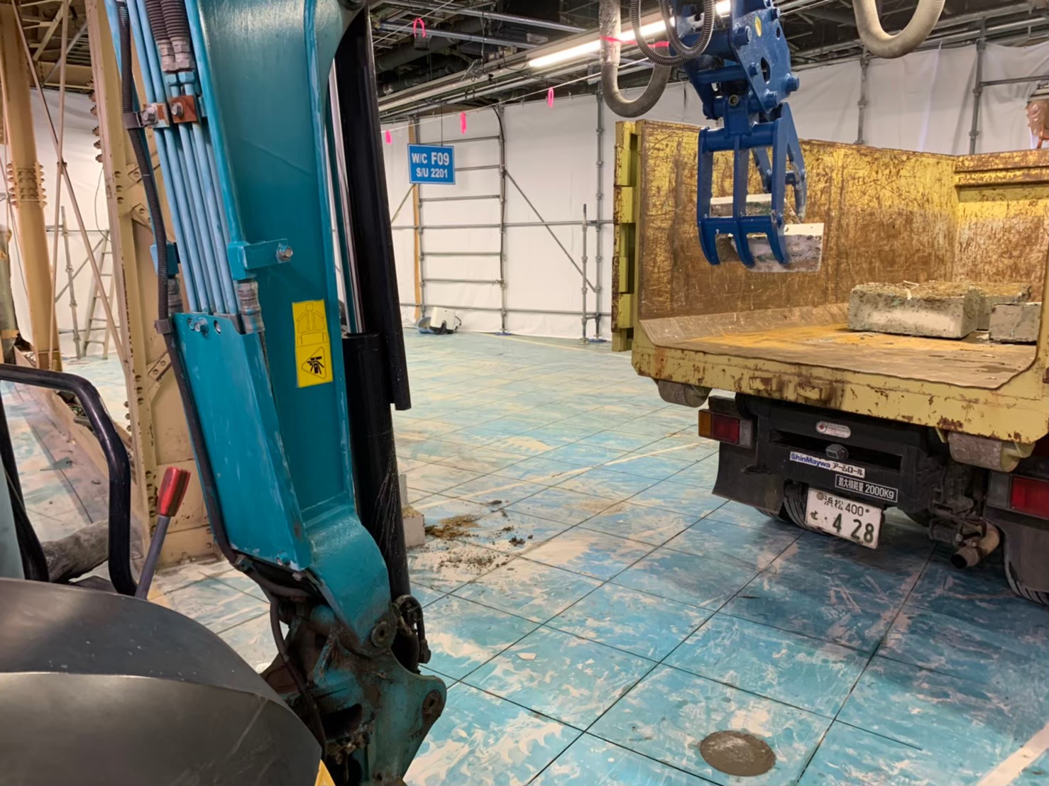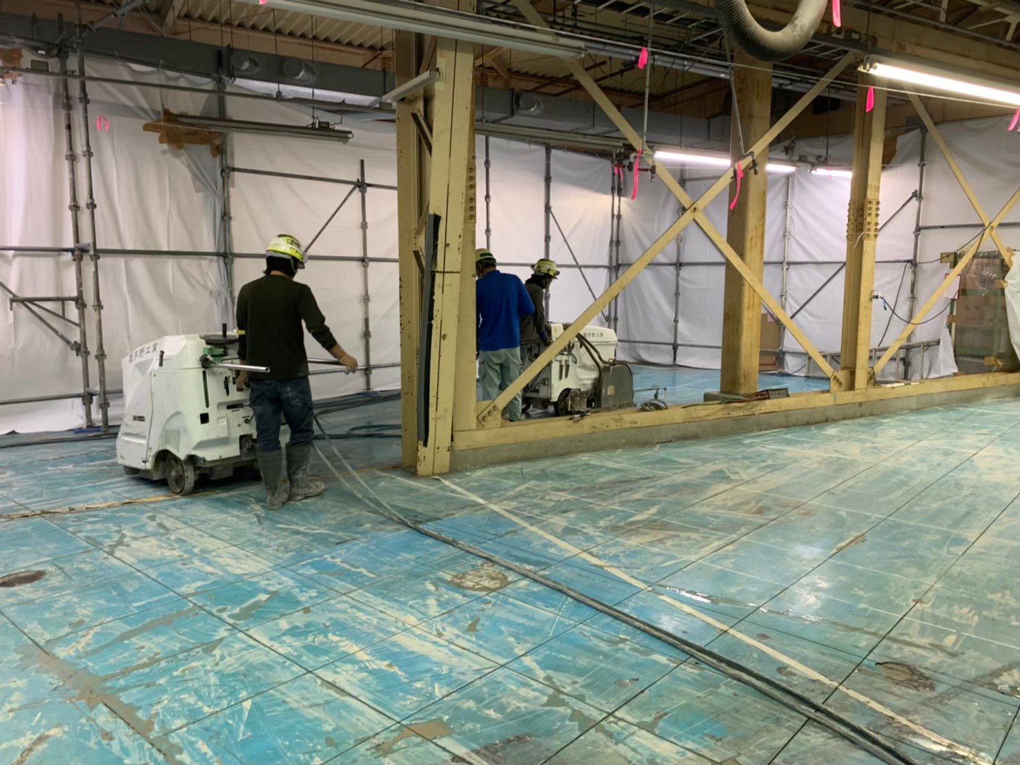 施工区画内を全面、防炎シートにて囲い、土間の撤去もカッターを使い賽の目に切断しブロック状にて撤去する方法をとりました。