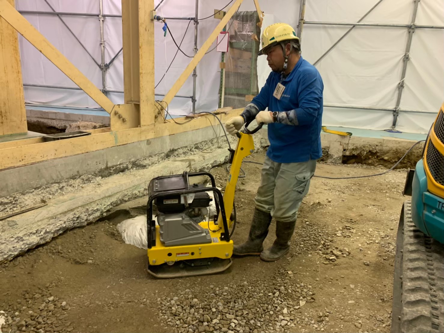 土壌撤去後、砕石にて置き換え、転圧作業です。