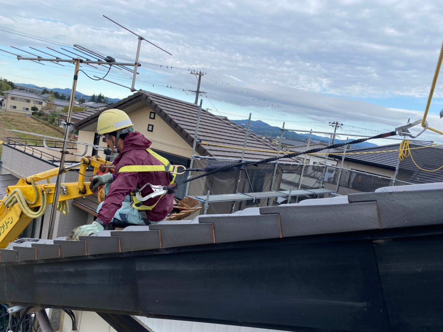 地上高が8m近くある為、屋根に上る人間はフルハーネスを着用し、1人1本の親綱を設置しています。