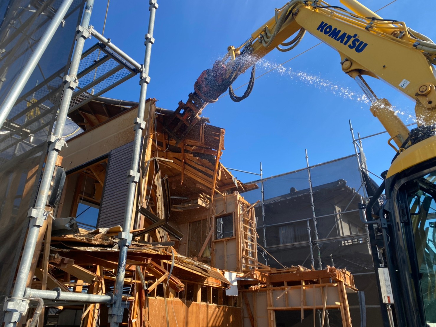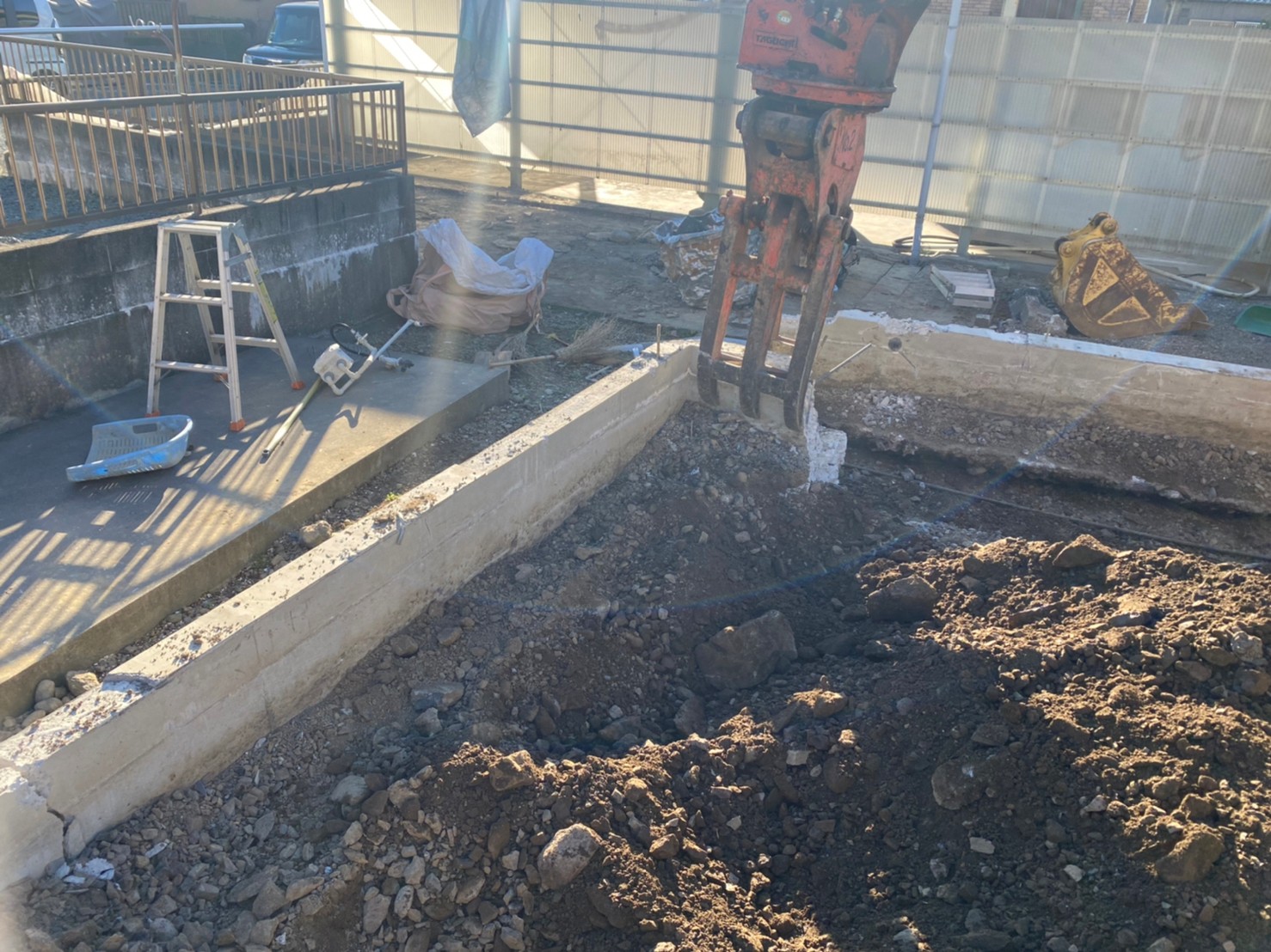 バックホウを使用しての上屋の解体、基礎の解体状況です。