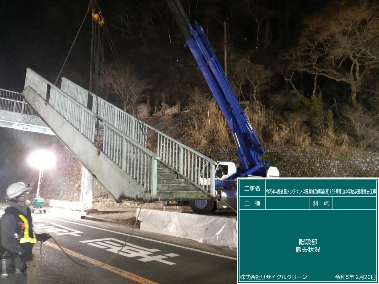 工事は夜間にて3日間に分けて階段部分・通路部分・支柱部分の撤去を行いました。