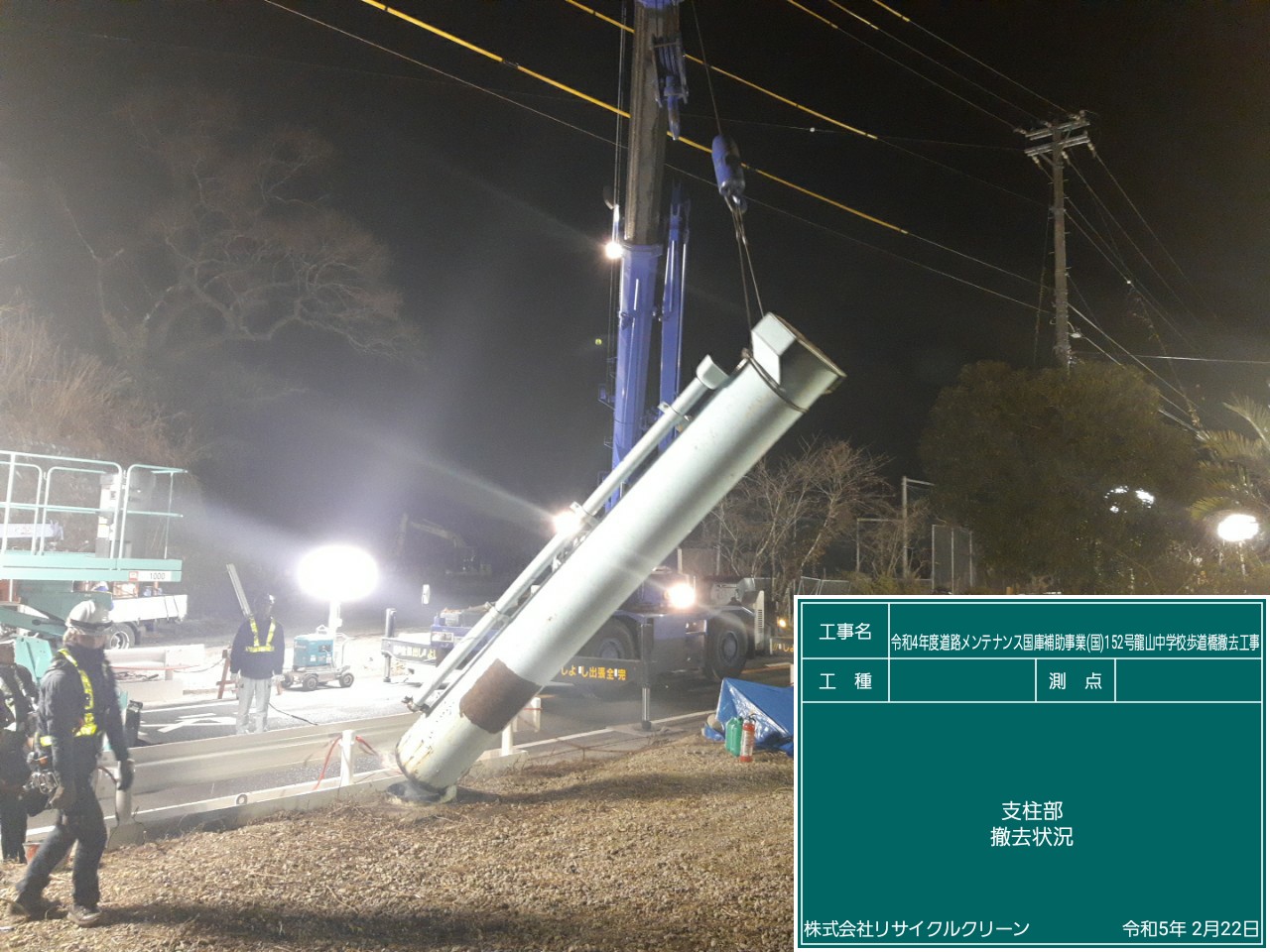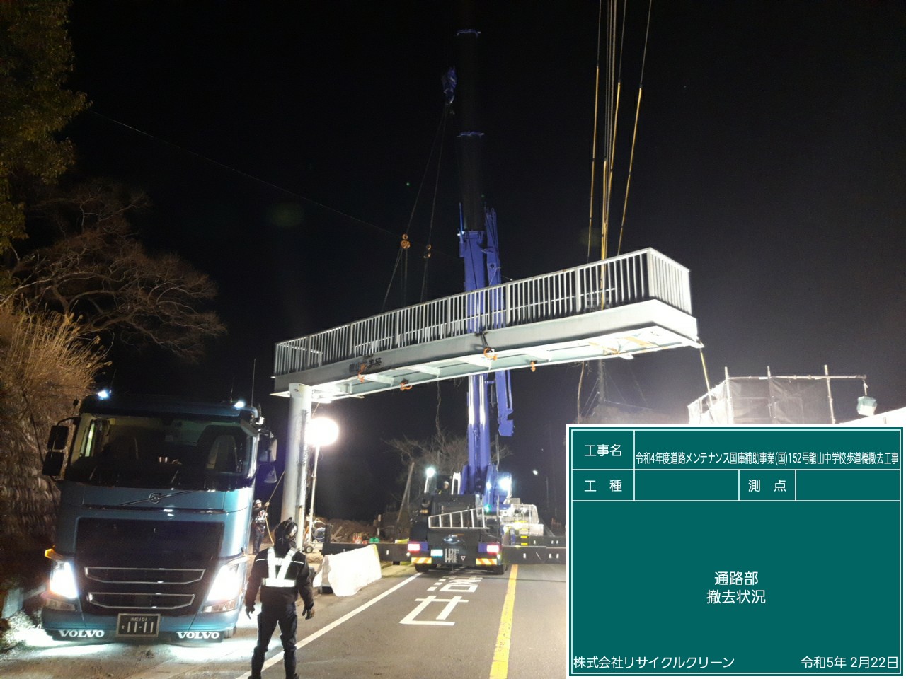 夜間工事にて歩道橋本体の撤去を行いました。
