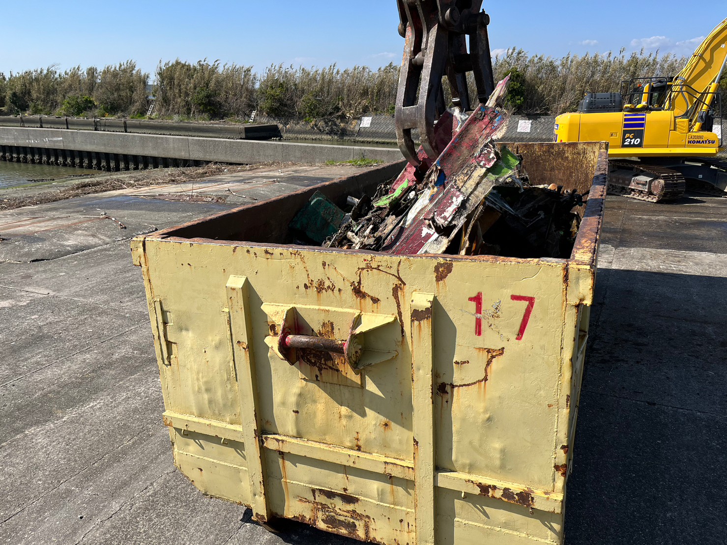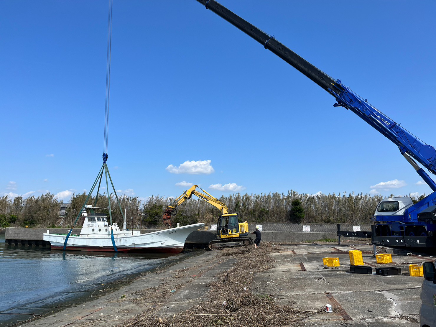 燃料、オイル抜きからスタートし、陸揚げの揚重、解体積込の一連の作業をしました。