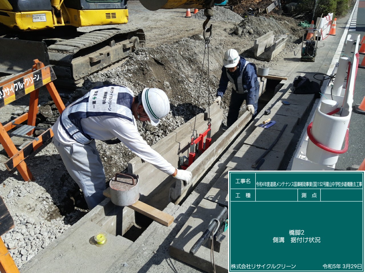 歩道橋基礎撤去に支障となる側溝を一時撤去して基礎撤去後、再設置します。