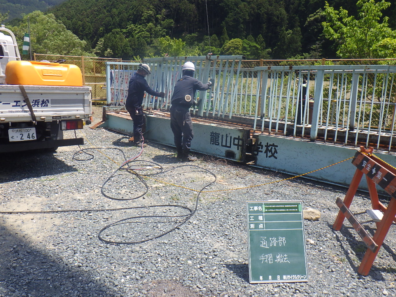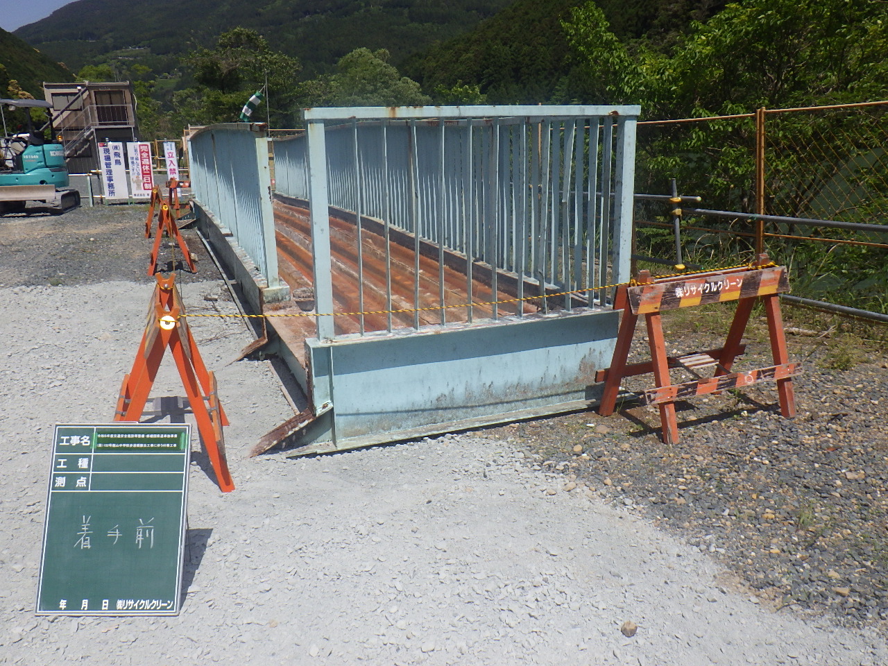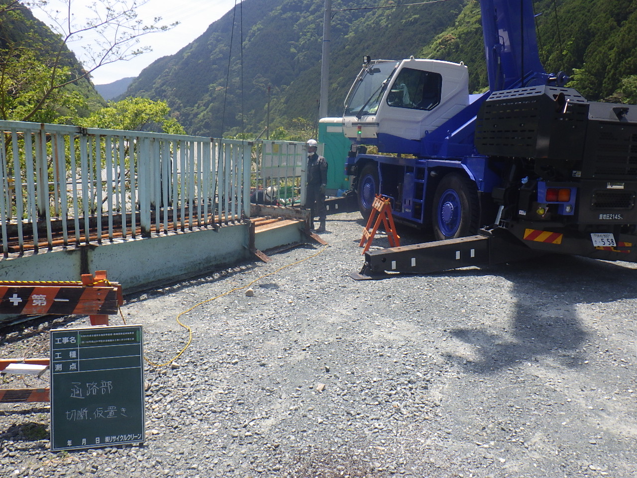 浜松市天竜区瀬尻にて撤去を行った歩道橋を運び出しができる大きさに