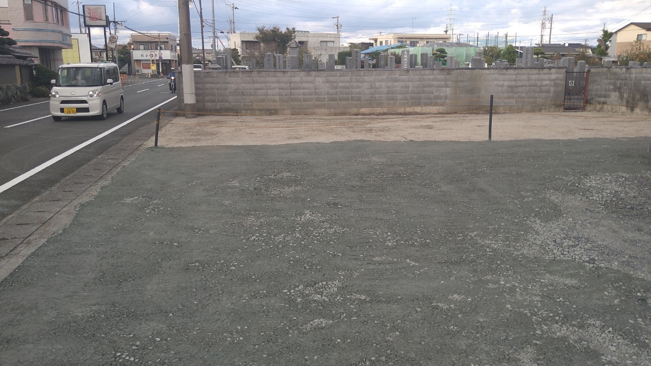 最後に、お借りした駐車場も借りる前よりきれいな状況でお返しするため、砕石を搬入、不陸整正をし完了です。