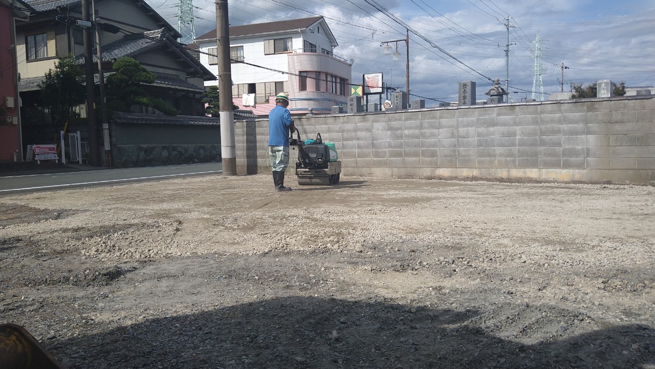 基礎解体後、駐車場として利用計画があるため、RC0-40(再生砕石)を敷き均し転圧をし、仕上げます。