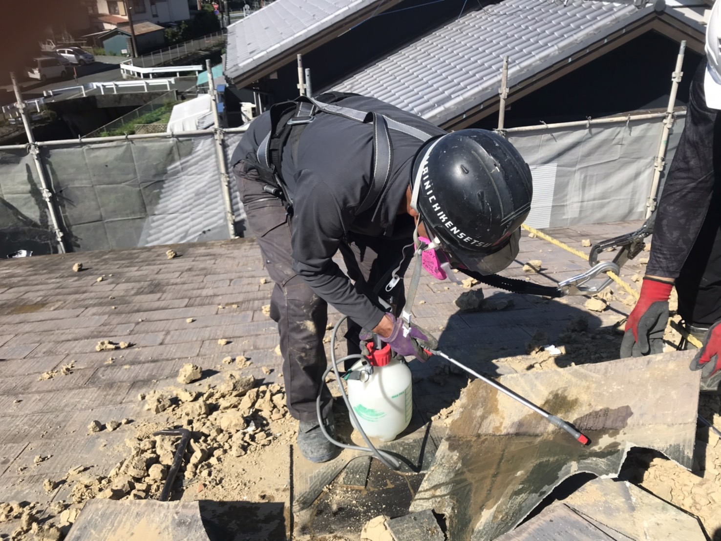 散水しながら割れないように注意してカラーベストの撤去を行います。