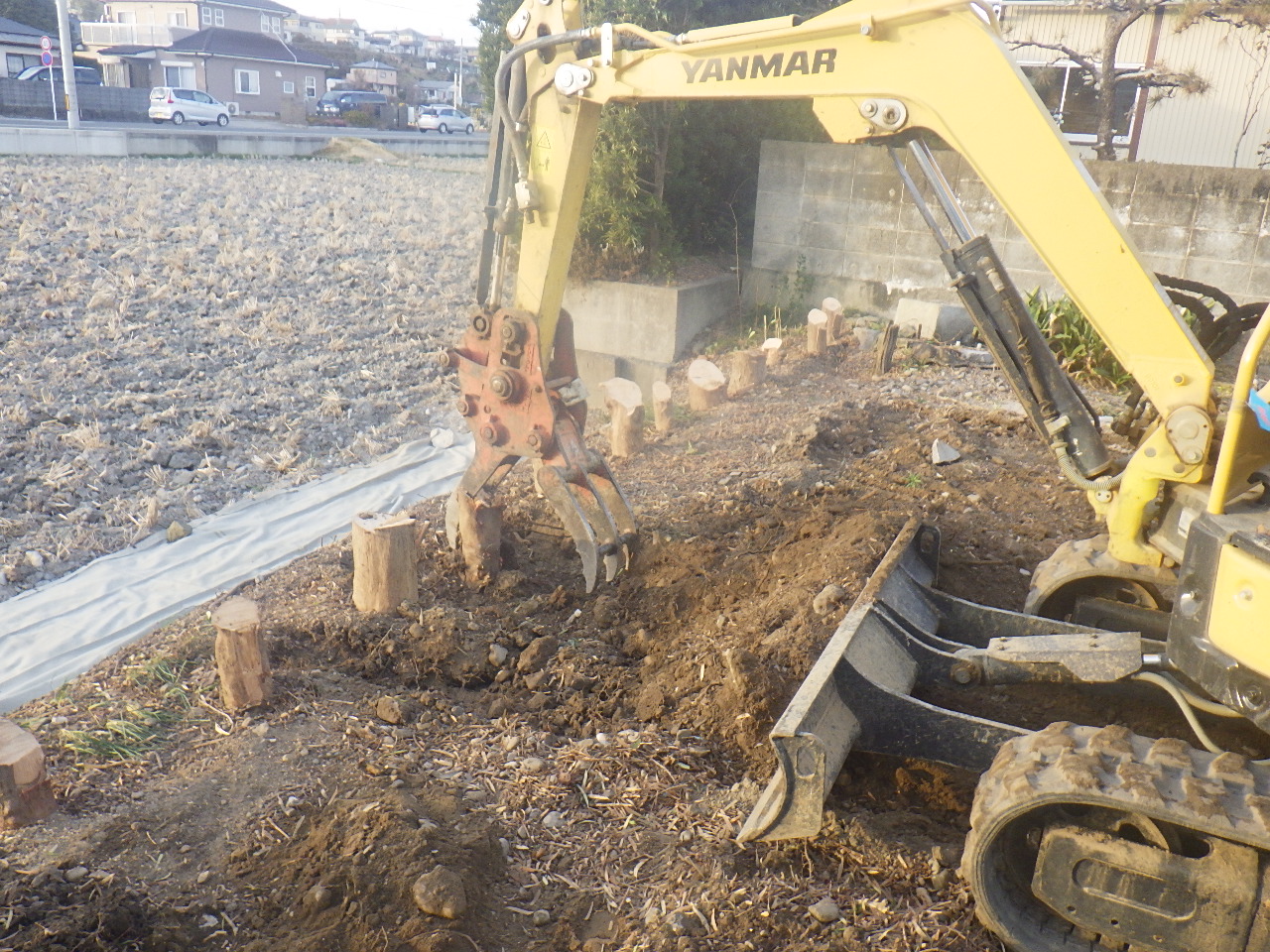 伐根時に隣地の田んぼに土砂等が混入しないように養生を行い