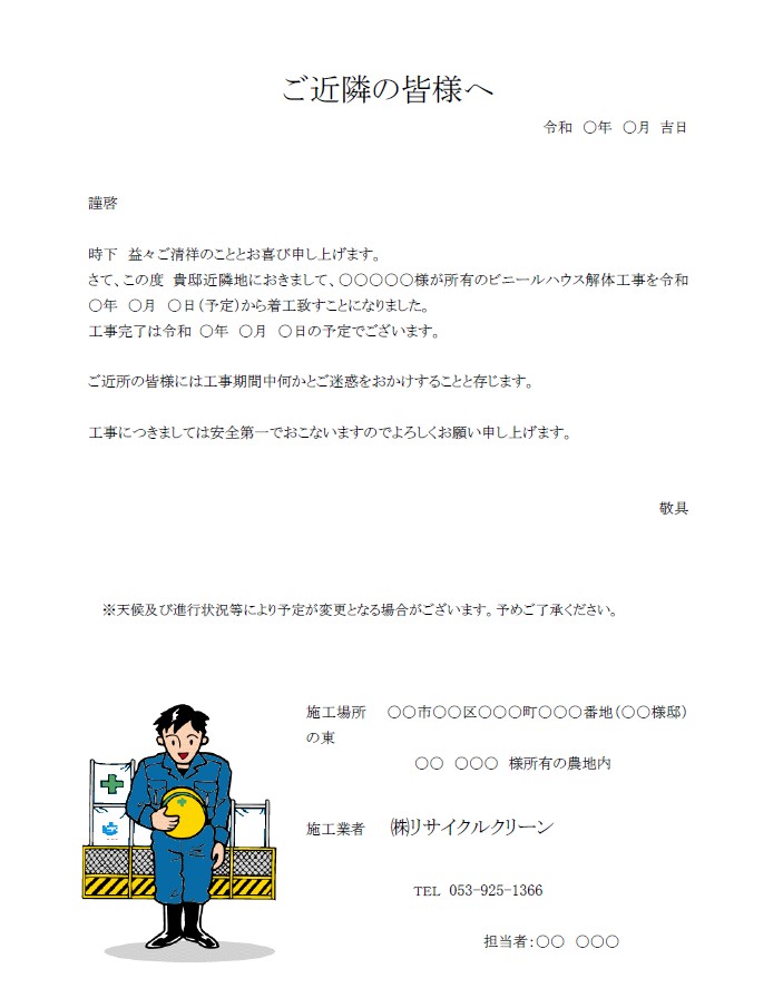 リサイクルクリーンは、解体工事着工前に近隣住民の皆さまへのご挨拶をはじめ、現場管理においても徹底したマナーを実践しています。