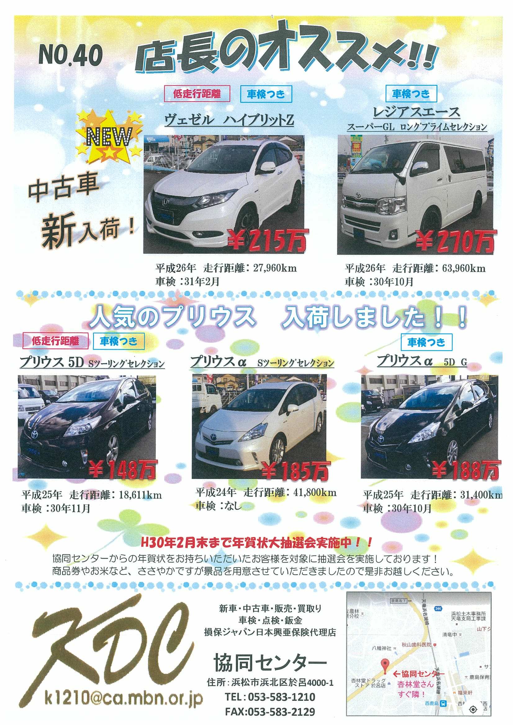 弊社の車販売部門「協同センター」では、販売用車両が続々入荷中です。中でもオススメ車両は低走行距離のハイブリット車両。チラシの他にも特選車両を多数ご用意してお待ちしております。