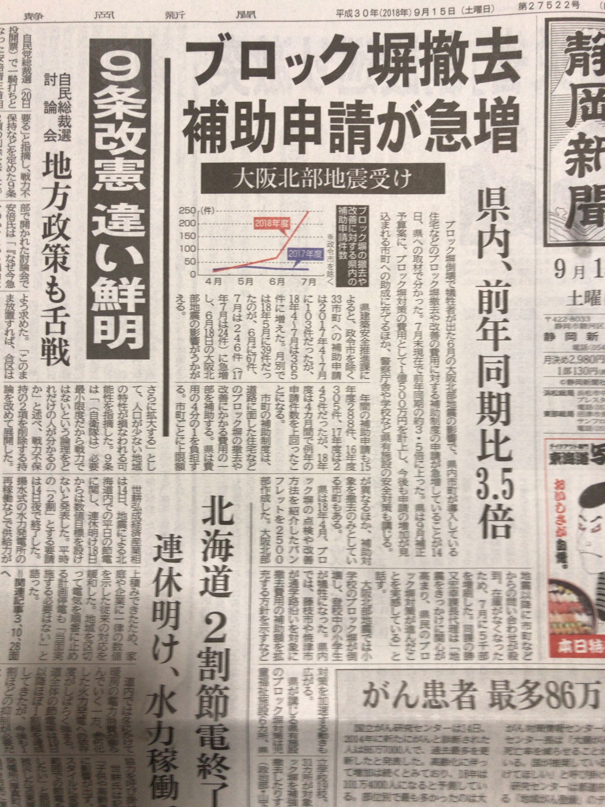 本日の静岡新聞の一面記事に「ブロック塀撤去補助申請が急増」という記事が掲載されていました。