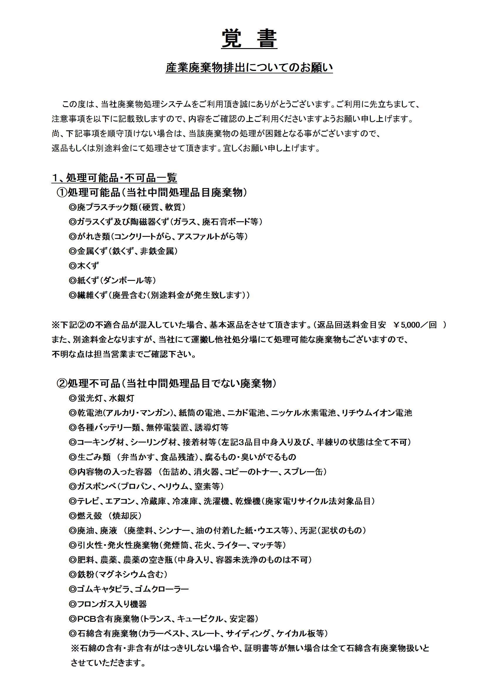 廃棄物への危険物(弊社中間処理不適合物)除去について、弊社営業社員による周知活動及び書面配布、ホームページに記載等を行っていきますので、何卒ご理解のほどよろしくお願いいたします。