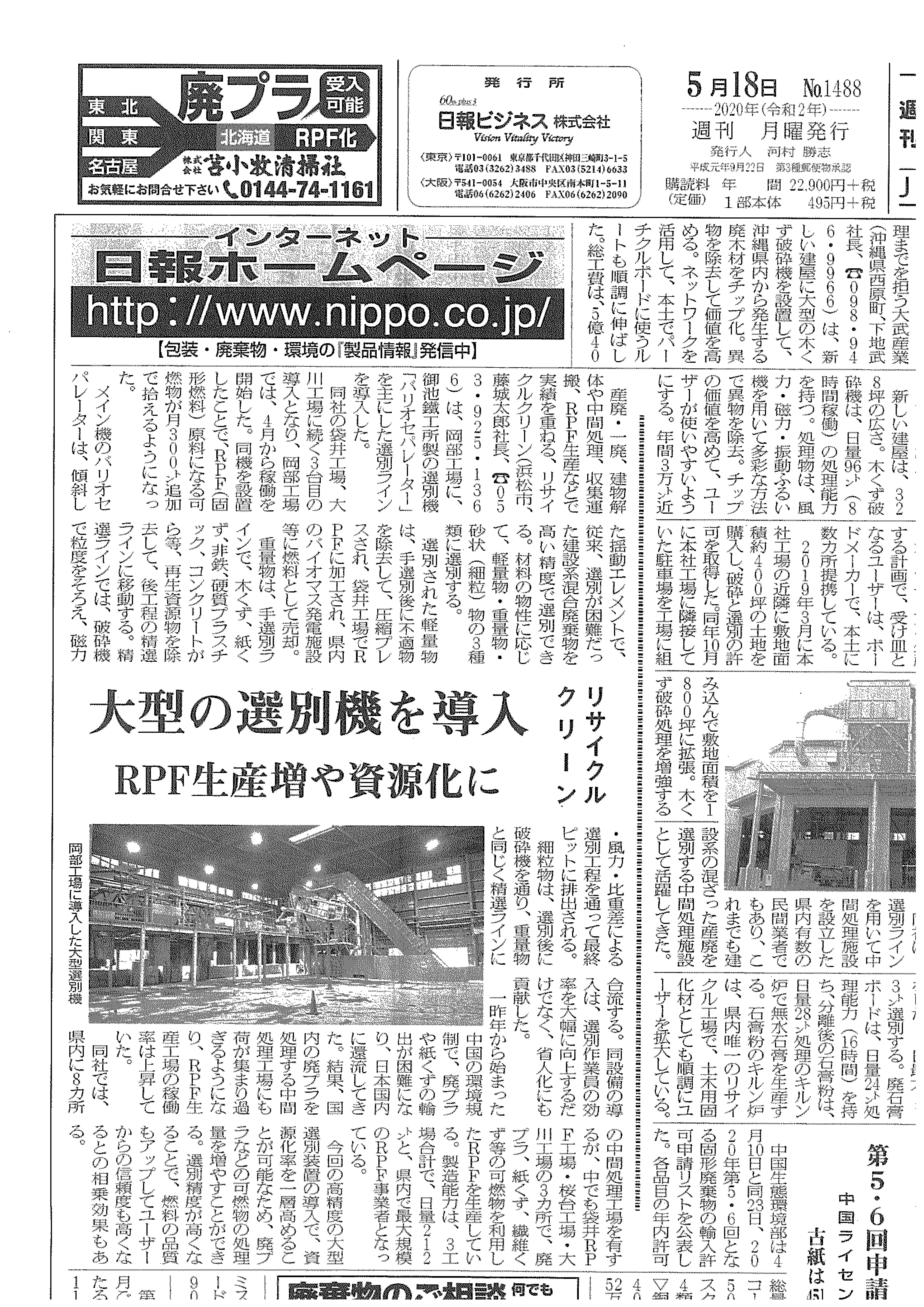 循環経済新聞5月号に、弊社岡部工場(藤枝市岡部町)の記事が掲載されました。