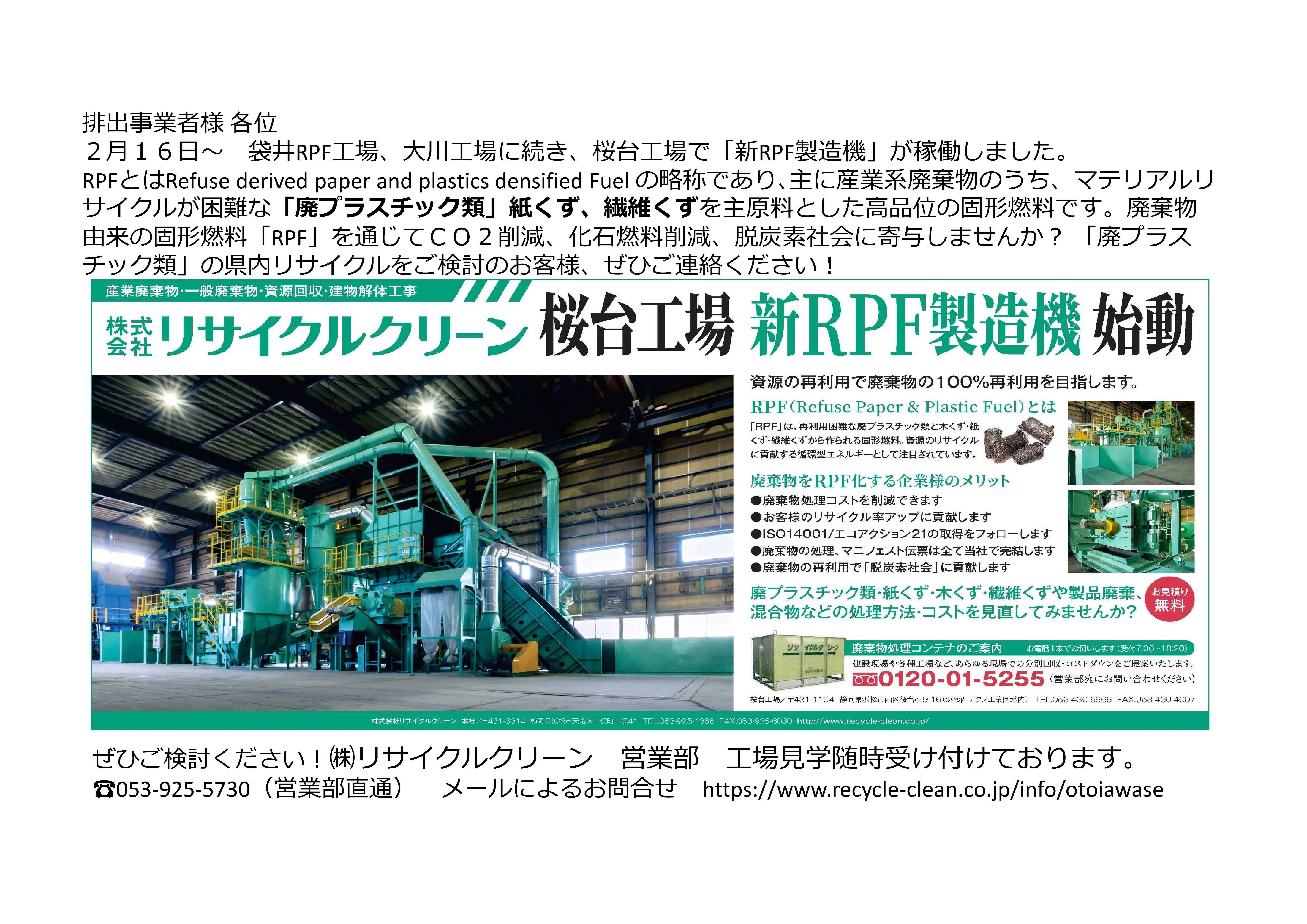 2月に生産開始した桜台工場のRPF設備が順調に稼働しています。「RPF」とは、廃プラスチック、紙くず、繊維くずなどの可燃性の廃棄物を使用して作る化石燃料の代替え品で、主に製紙会社等のボイラー燃料として利用されています。弊社では大川工場(浜松市天竜区大川)、袋井RPF工場(袋井市村松)、桜台工場(浜松市西区桜台)の3工場で、廃棄物由来の固形燃料「RPF」を製造・販売しております。廃棄物の有効利用をお考えのお客様はぜひお問い合わせ下さい。