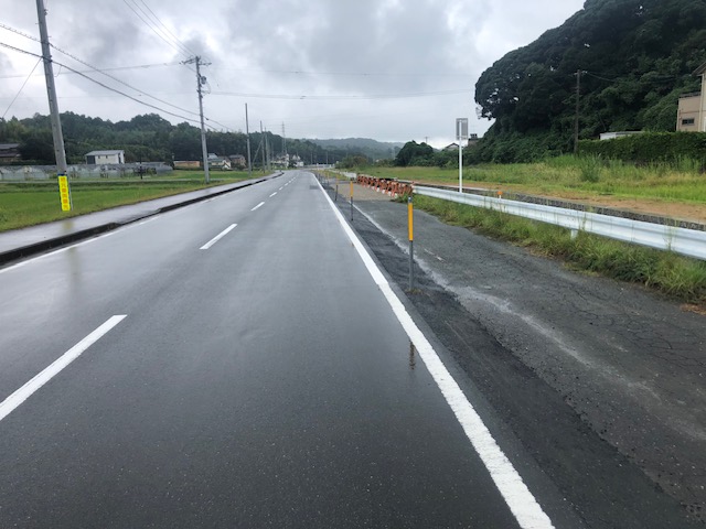 交通量は少なく見通しが良い道路はスピード出す車両が多いので要注意。夜勤もあるので深夜の時間帯も通る道です。街灯は少ないものの道路の両側に広い歩道がある(一部工事中)のは多少安心できます。