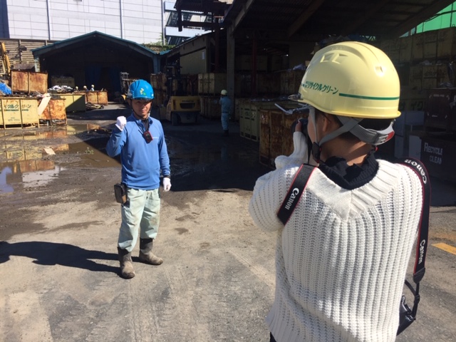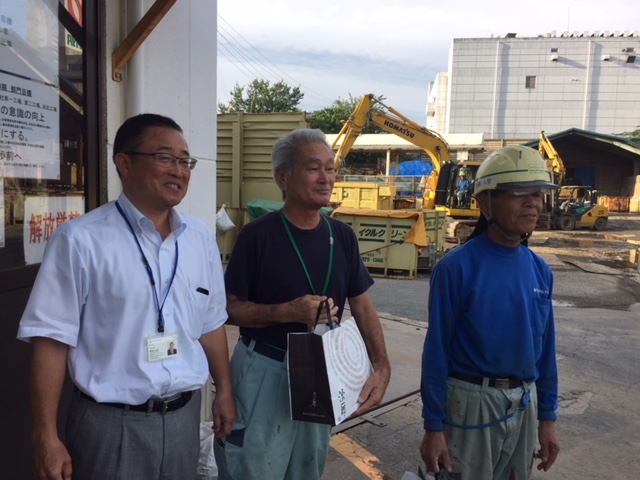 現場の方では本社工場のT主任。女性カメラマンに向かってガッツポーズ。呼び止められた時は嫌そうだったのに、満面の笑み。