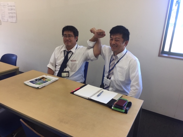 営業部長と廃棄物グループH主任。営業活動に関する打ち合わせを終え、成功を確信しガッチリとポーズを決めるイメージ。