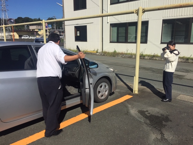 打合せを終えると意気揚々営業車両プリウスに乗り込むH主任。台風一過、颯爽と営業活動に向かうH主任のイメージ。