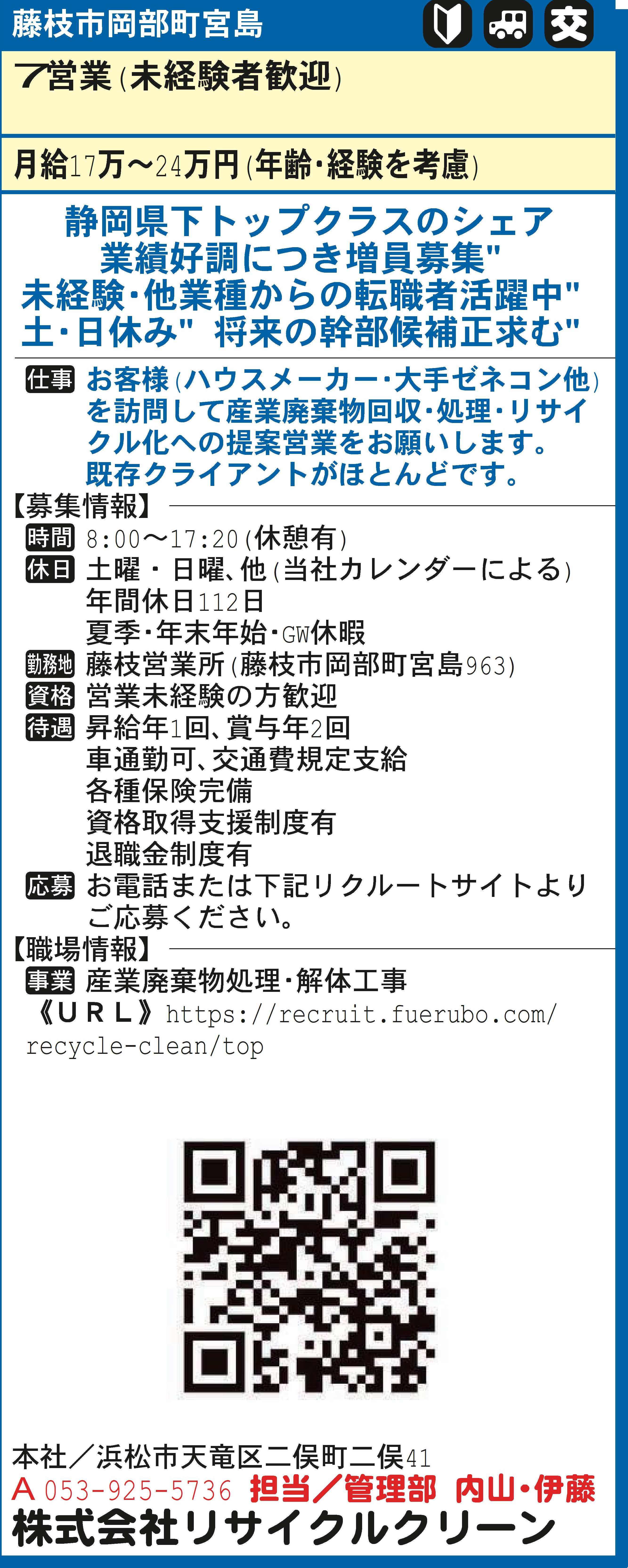 藤枝営業所(藤枝市岡部町宮島963)の営業職【正社員】の求人です。業績好調につき増員募集。未経験・他業種からの転職者も多数活躍中。産業廃棄物処理会社としては静岡県下トップクラスのリサイクルクリーンで働きませんか。当社を背負って立つ将来の幹部候補として是非チャレンジ!