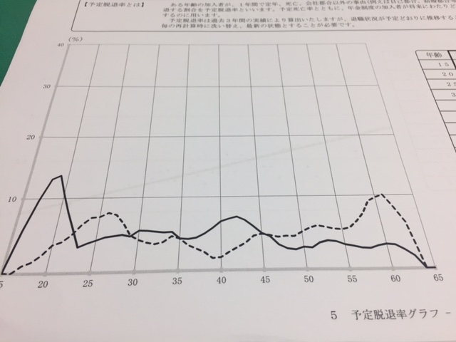 その理由はこのグラフ。予定脱退率の変化によるもの。前回の再計算時(5年前)に比較して特に20代と45歳以降の予定脱退率が大幅に低下しています。予定脱退率とは簡単に言うと中途退職により年金制度から脱退する割合。逆に言えば、社員の定着率が大きく向上しているということです。それ自体は良いことですが・・。