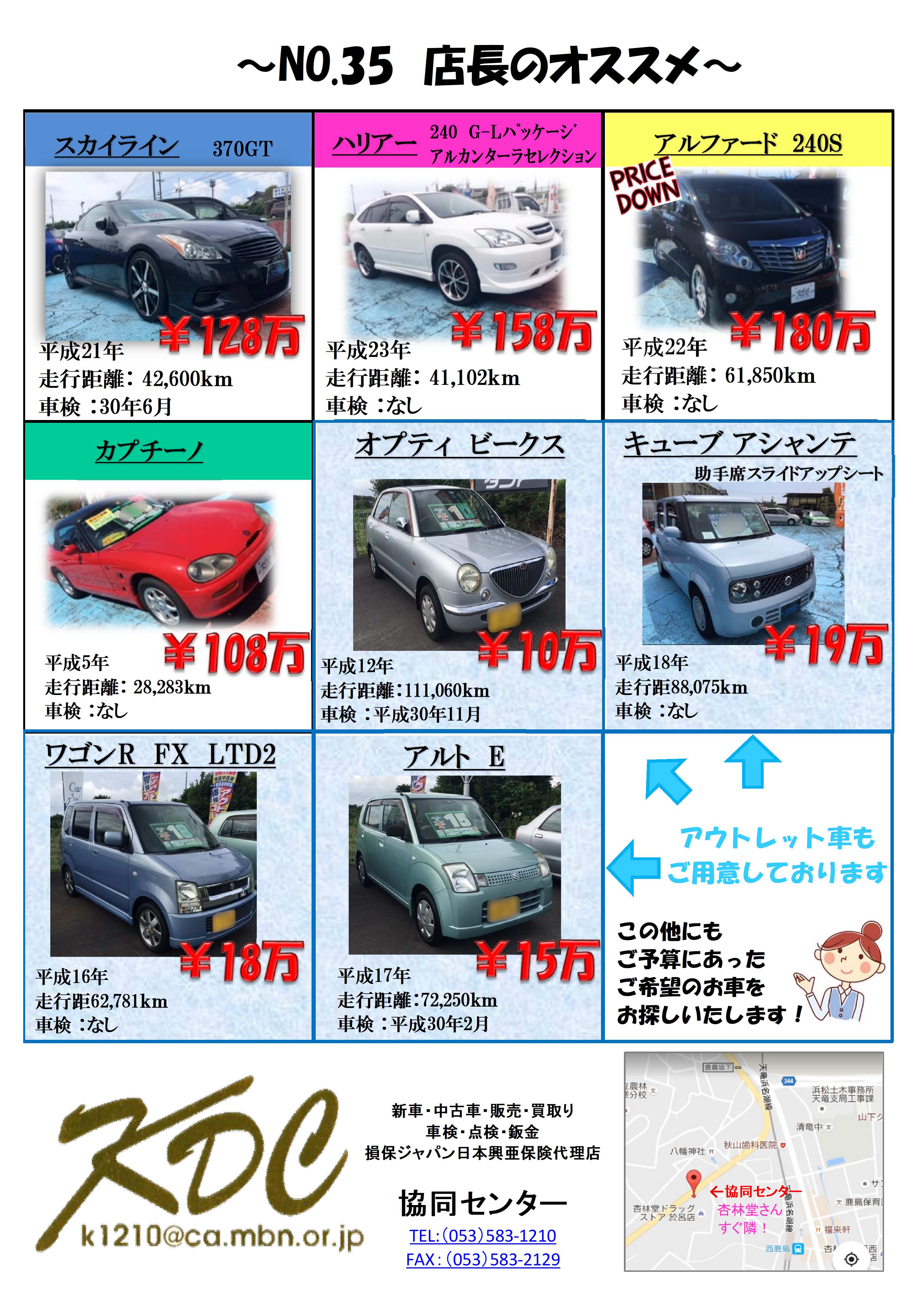 協同センターからのお知らせ。今月の「店長のオススメ」。ファミリー向けのワンボックス車、男子好みのスポーティー車の他にお手頃なアウトレット車もあります。