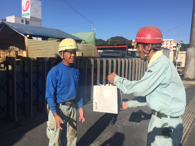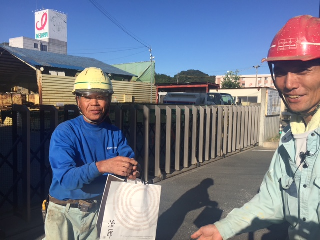嬉し恥ずかしの贈呈式。贈呈するのは本社工場の市川工場長(赤ヘルの人)。受け取るのは同じく本社工場の町田さん(通称マッチー)。まだまだ元気な御年69歳。はにかんだ笑顔が何ともいえず良い、でしょ?