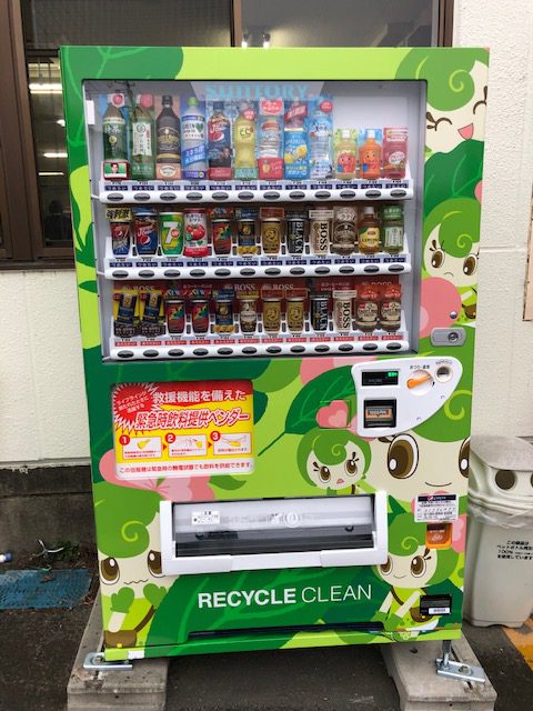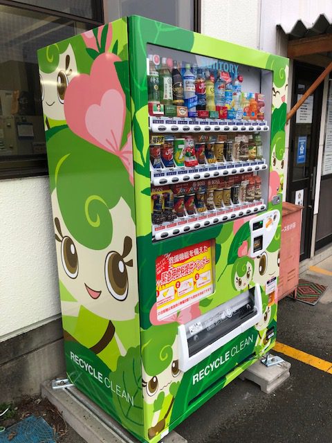リサイクルクリーンのイメージキャラクターであるクリンちゃんのラッピングを施した自動販売機です。最近、ラッピングのデザインをリニューアルしました。