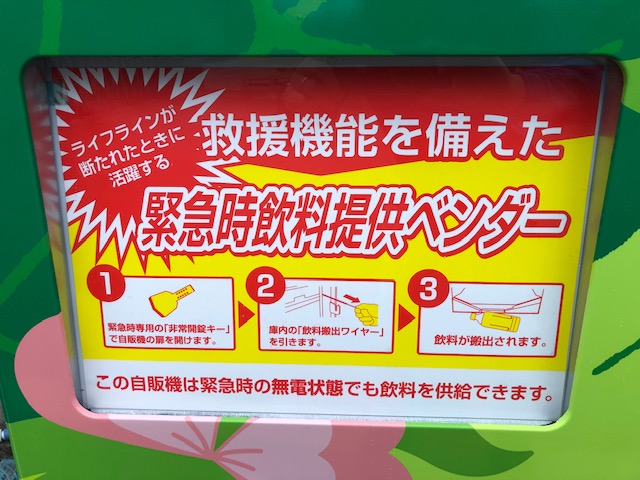 さらに、この自動販売機は停電状態でも飲料を供給できる「緊急時飲料提供ベンター」となっています。BCP対策の一環としてライフラインが断たれた場合、自社のみならず地域に対する救援機能を想定しての導入です。