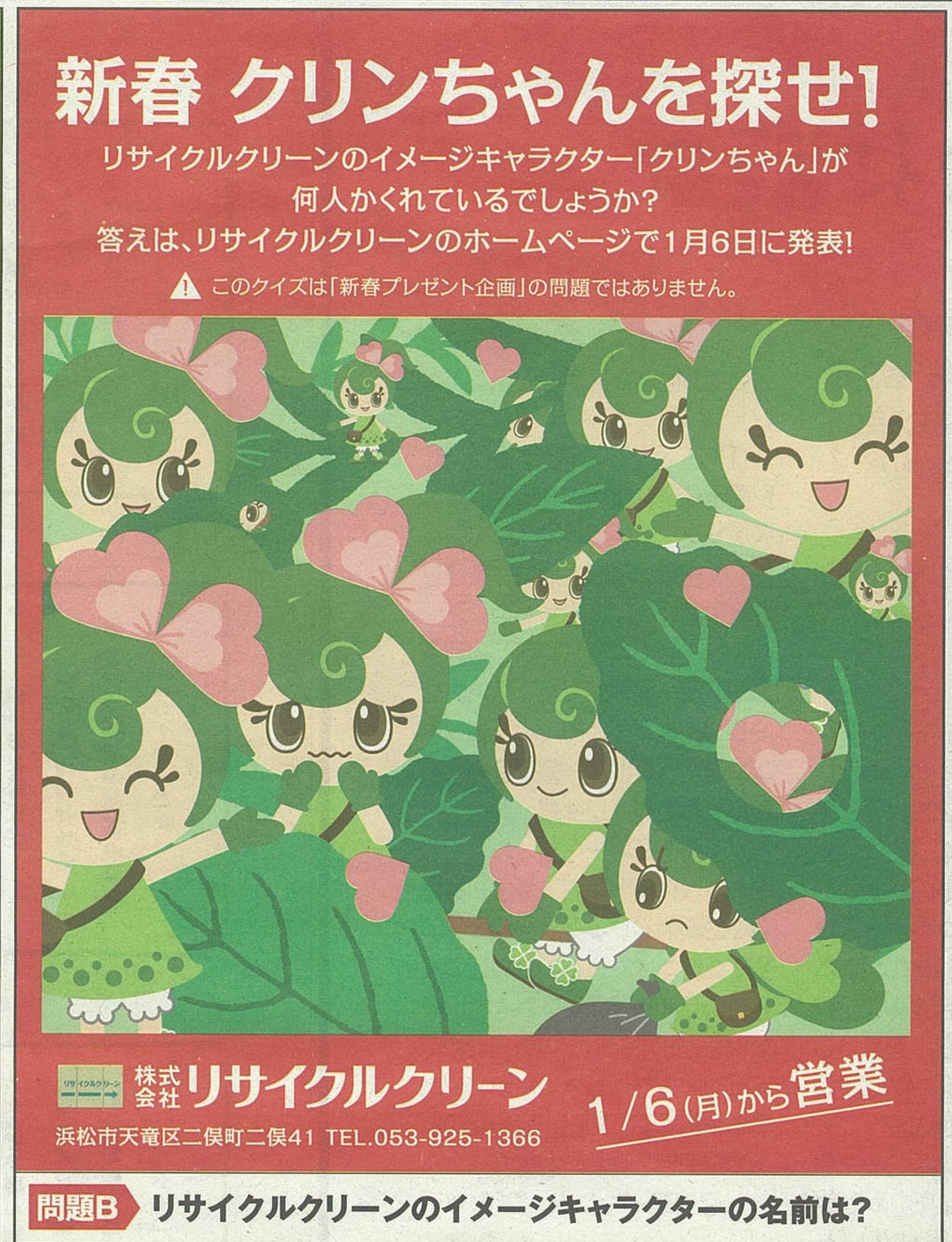 今年の元日の静岡新聞(西部版)および中日新聞に弊社の広告「クリンちゃんを探せ!」が掲載されました。ご覧になられた方も多いでしょうが、ご覧になっていない方々のためにこのブログで再掲します。