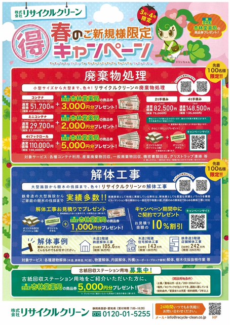 3月から開催しています、とてもお得な春のご新規様限定キャンペーンは今月末までとなっています。ご契約により3千円から5千円の杏林堂薬局の商品券をプレゼント。