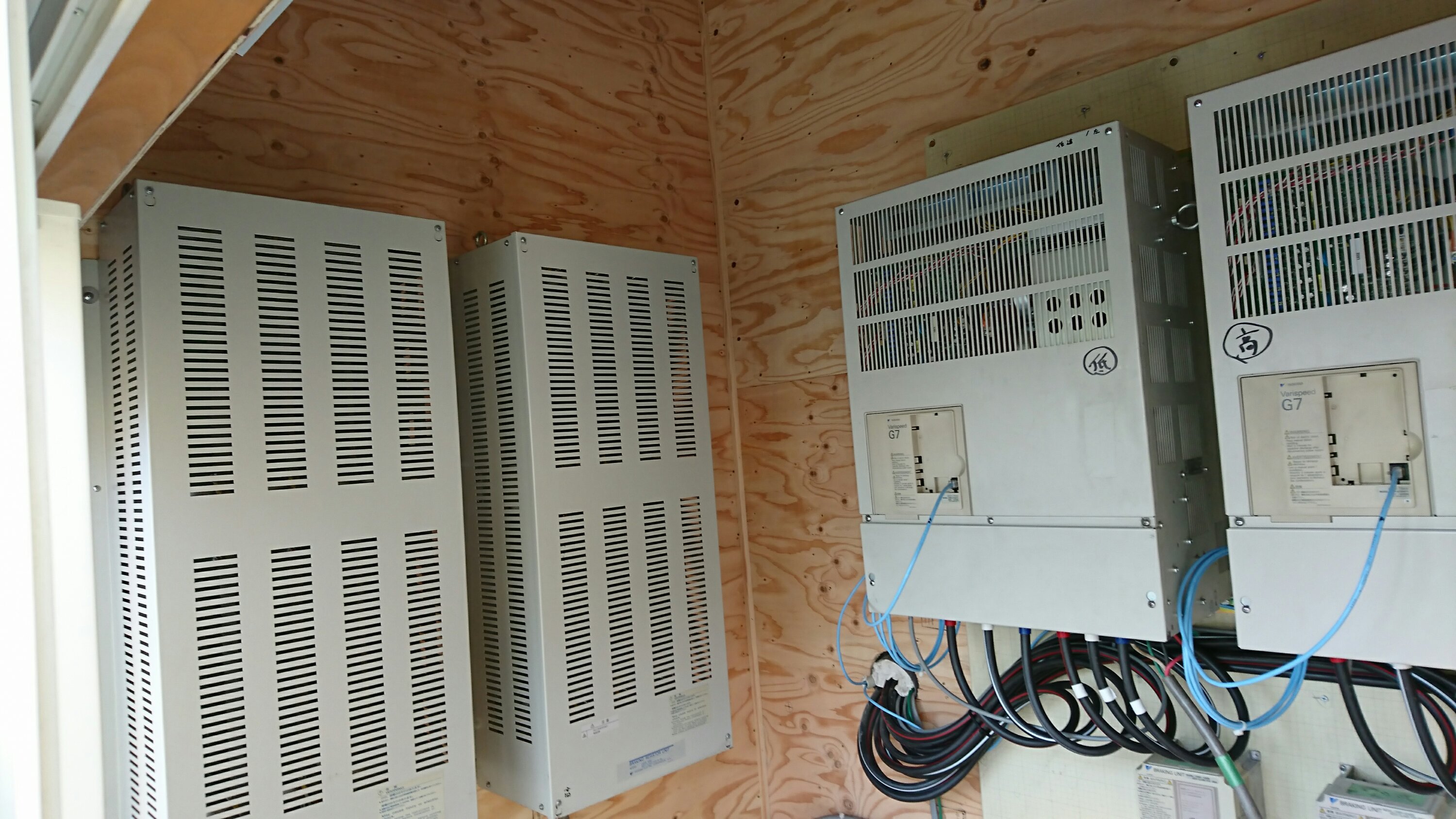 こちらは天井クレーン設置後の写真です。何故設置したかといいますと段々消耗品の数が増えてきて置場に困りいろいろ検討した結果クレーン取り付け、2Fスペースに保管というかたちに辿り着きました。きっと活躍してくれると思います。そしてもうひとつはインバータの移設です。新たに工場外に小屋を作りそこに移設しました。なかなかこの機械もデリケートに出来ていまして非常に埃に弱くちょっとしたこことで破損してしまいます。当然修理代もお高め⤵なにより電気代に直結してしまいます。本当に工事をやらしていただき感謝です。必ず5S、経費削減に繋がっていくでしよう😄