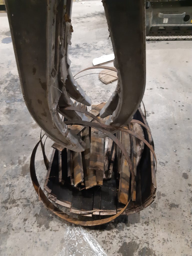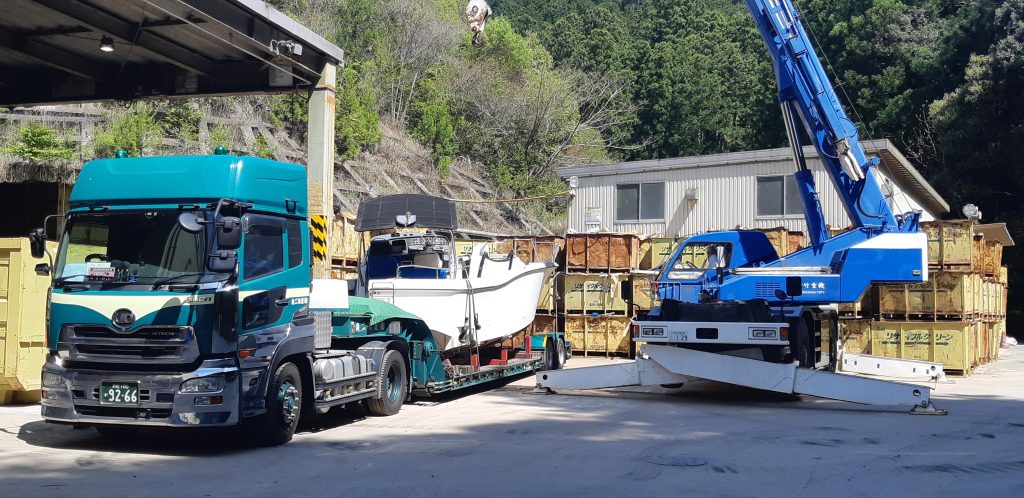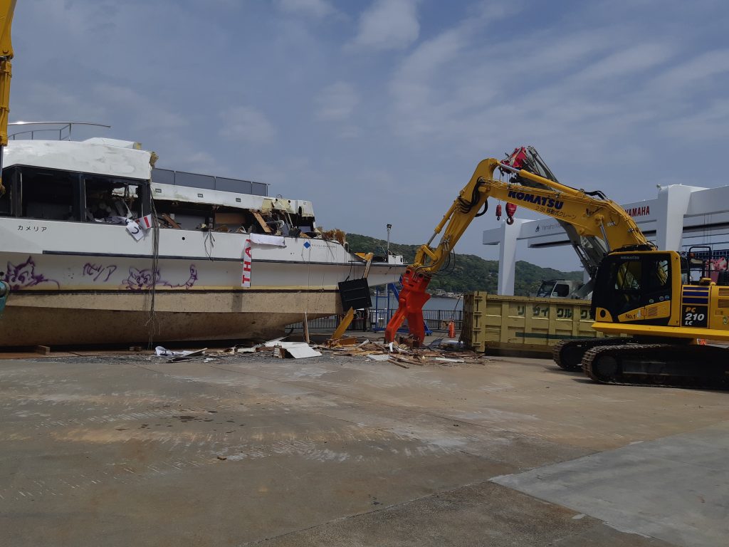 重機を2台使用する理由は1台が船を掴み押さえもう1台が掴み切りちぎっていくためです。あとはひたすら小さくして大型コンテナに詰めて弊社の大川工場へ運搬するだけです。もちろん大川工場ではさらに解体されて細かく分別されリサイクルされていきます。以上賞味4日間の作業でしたが無事終えることが出来ました。このように大きな物、特殊な物などの処理でお困りの方がいましたらお問い合わせください。しっかり対応し、処理させていただきます。