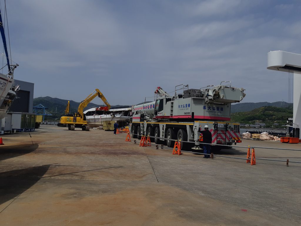 先日、舟艇工業会についてお話させていただきましたが、今回は大型クルーザー船の解体作業について投稿したいた思います。現場は浜名湖にある某マリーナです。マリーナからクルーザーを陸揚げするために使用したラフターは500tクレーン車でした。通常ではあまり見かけないとても大きなクレーンで使用するまでに腕を組み立ててから使用してました。
