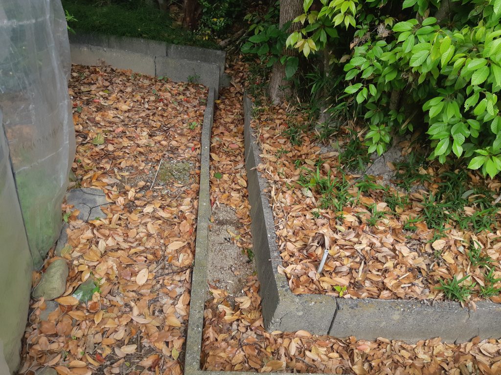 庭にはかなり大きな樹木があり伐採、伐根には少し苦労しそうな感じがしました。気になった隣地境の庭裏へ行ってみると木の根子が側溝下を這っているような状況で、水道管もこの付近を通っているような状況でした。