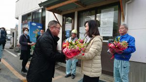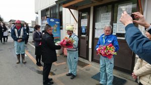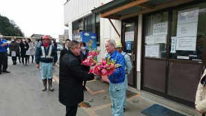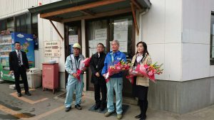 今週の月曜日にリサイクルクリーン本社の朝礼で長年業務に努めて、定年を迎えた3人に花束の贈呈がありました。