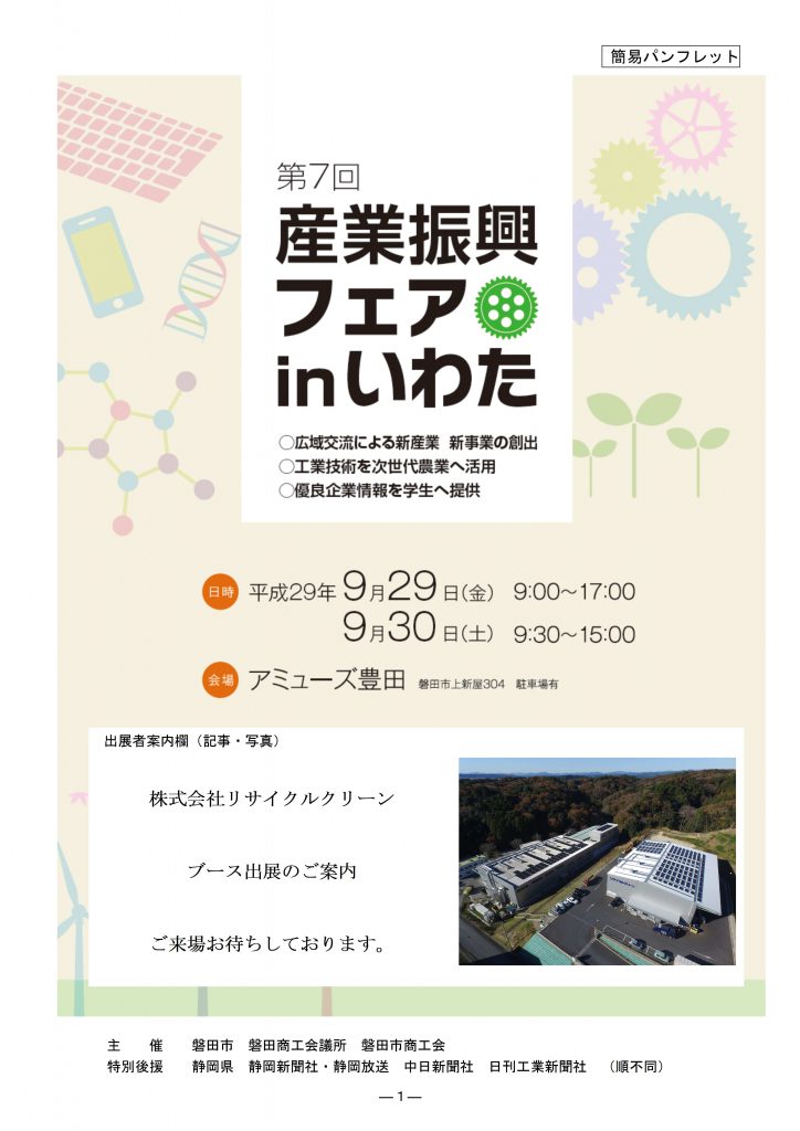 毎年11月頃あったイベントが今年は9月にあります。リサイクルクリーンは産業廃棄物運搬処分・解体工事についてのブースを出展します。