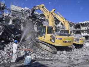 現在の状況は解体用の足場の完了、内装の撤去が完了し、バックホウ2台で上屋を取り壊している状況です。
