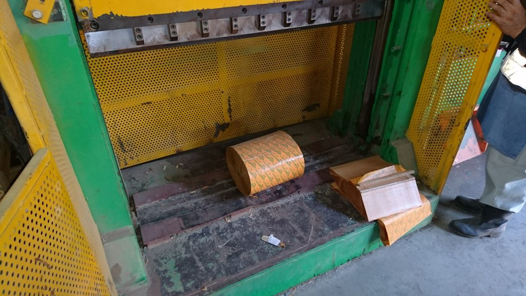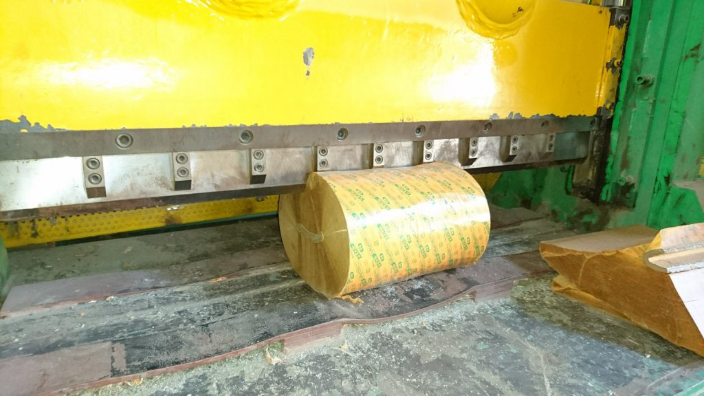 上から刃が降りてきて、ゆっくりと切断していきます。