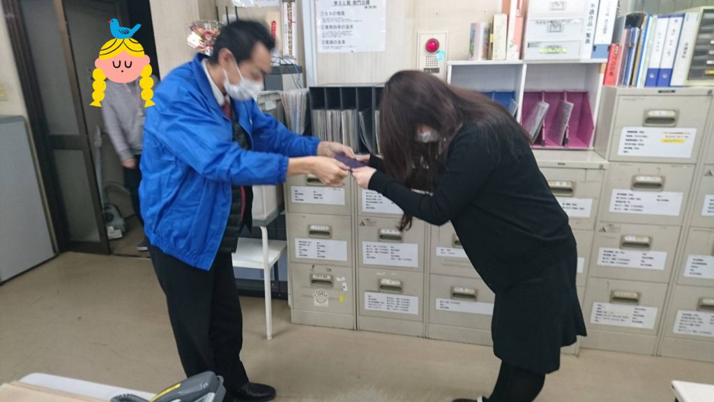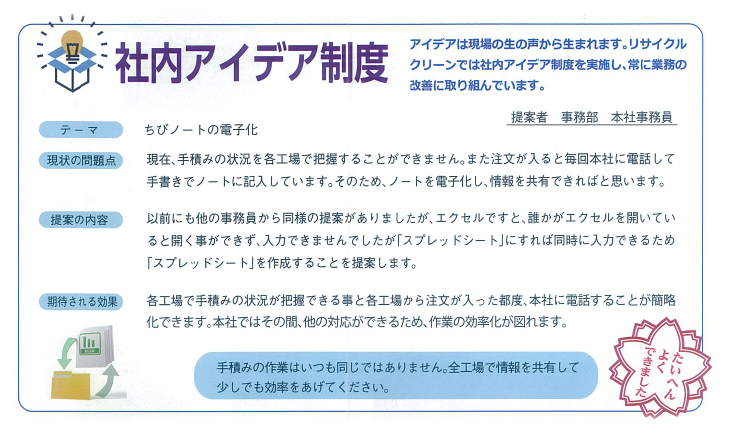 未分類 アイディア制度 2018年3月19日 本社事務所 こんにちは、本社事務所です。 ㈱リサイクルクリーンでは、業務の改善として 社内アイディア制度という制度がありますが、 今回本社事務員さんの意見が採用されました!!! 手積み作業の時は「ちびノート」を活用して 作業状況を把握していますが、それの電子化です。 情報の共有と、仕事の効率が上がりそうです☺ 表彰時☟☟☟