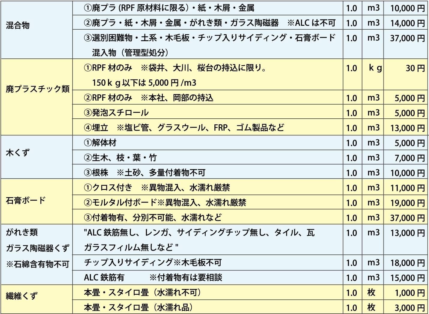 リサイクルクリーン本社工場では上記品目と価格にて受入れさせて頂きます。(事前に排出事業者様との契約が必要です)