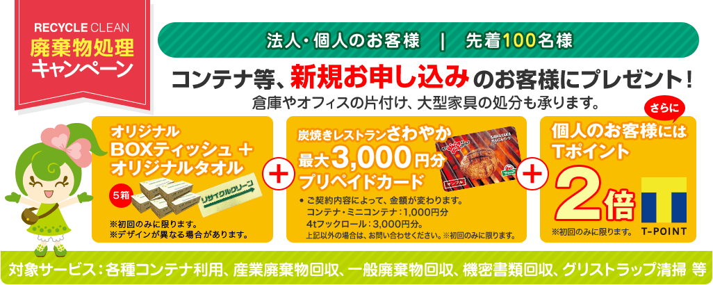対象サービスは、各種コンテナ利用、産業廃棄物・一般廃棄物回収、機密書類リサイクル、グリストラップ清掃