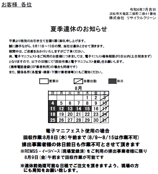 浜松市】8月お盆休み連休のお知らせ【リサイクルクリーン