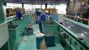 そして、重量物と軽量物の二本のラインに分かれ、そこで人の手によってさらに選別されていきます。