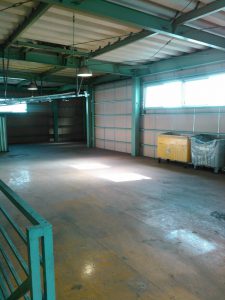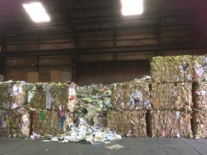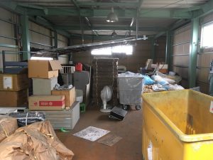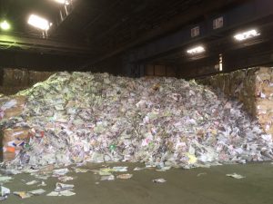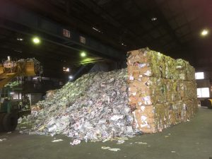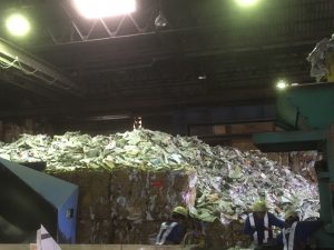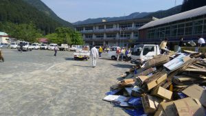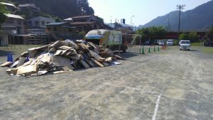 ダンボールの山があり、その横のフックには回収してきた古紙などを積み替えしている学校関係者・地区の方々が大勢いらっしゃいます。