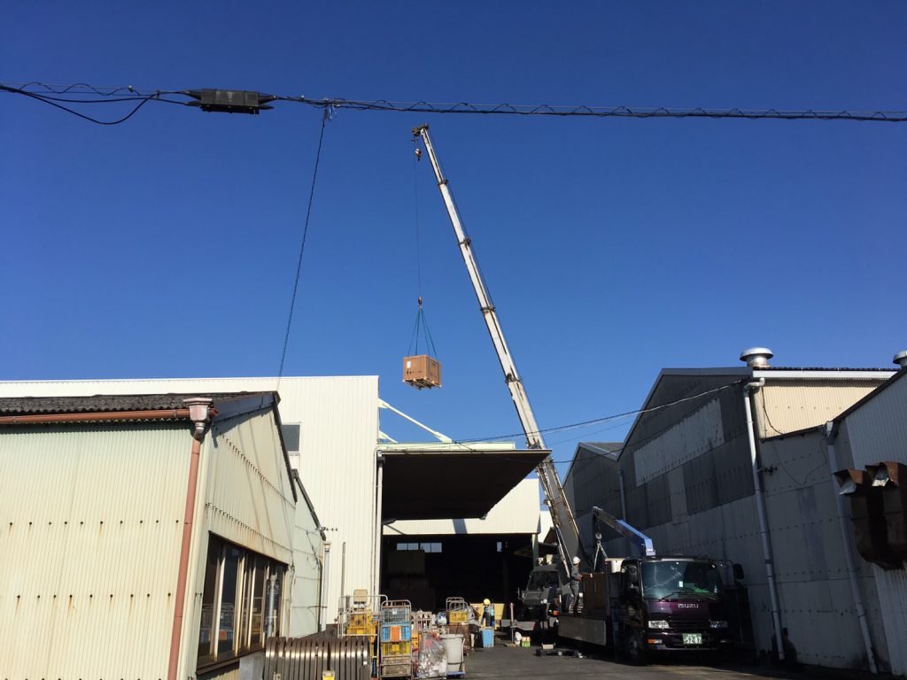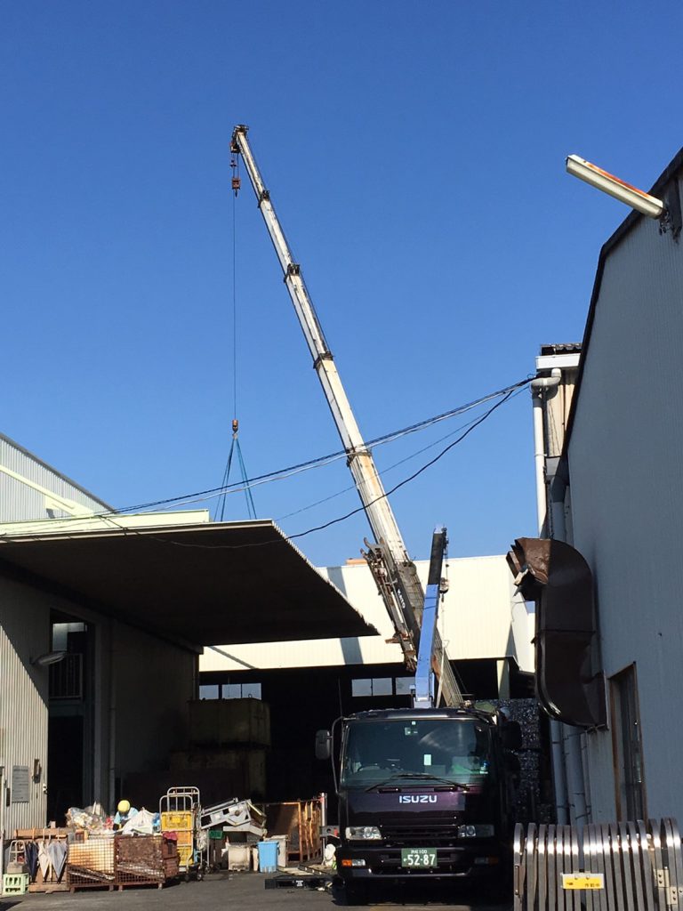 朝からクレーン車が来て資材を工場の屋根に運んでいました。