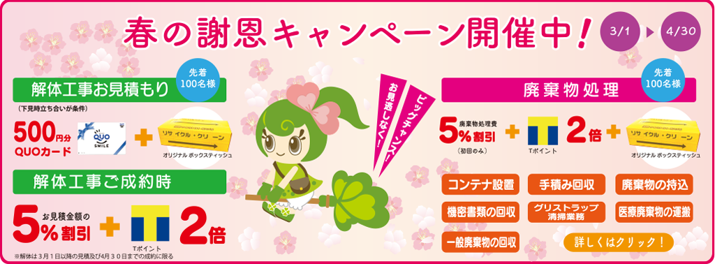 解体工事成約時、見積金額5%オフ+Tポイント2倍(個人のお客様)